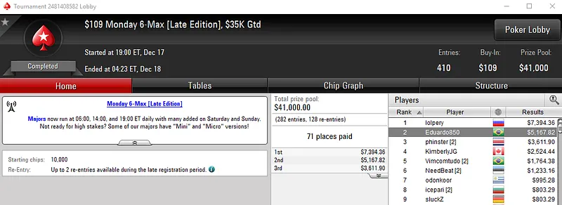 Já Rafael "GM_VALTER" Moraes também amealhou dois grandes resultados na reta de ontem. O maior foi a terceira colocação no High Roller Club: $1,050 Monday 6-Max com 97 entradas, onde embolsou $14,085. Na sétima posição, Cássio "cassiopak" Killes ainda levou para o caixa $4,894.