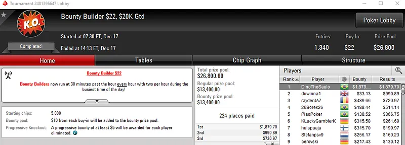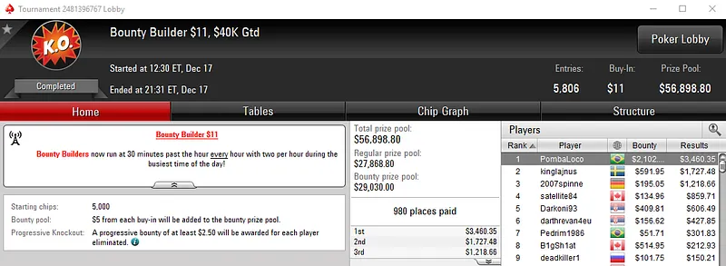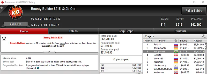 No High Roller Club: Bounty Builder HR, Rafael Moraes ainda forrou mais $3,946 na quinta colocação. Aqui, edu22.sp recebeu $14,499 depois de perder no heads-up e Danulla10 foi terceiro para $7,869. Com 243 entradas, este torneio distribuiu $121,500 de prize pool.