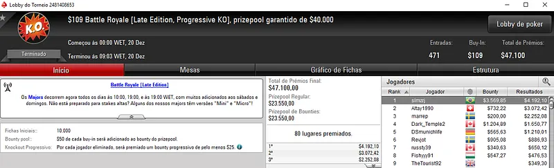 GuGuGFBPA foi um dos três jogadores que embolsou uma premiação de cinco dígitos na reta de poker onlien. Ele venceu o Bounty Builder $109 com 1,058 jogadores. O pódio ficou todo vestido de verde e amarelo com dans170' na segunda colocação para $10,414. Já a medalha de bronze rendeu $6,639 a Kenshinznho. Este evento repartiu o prize pool de $105,800.