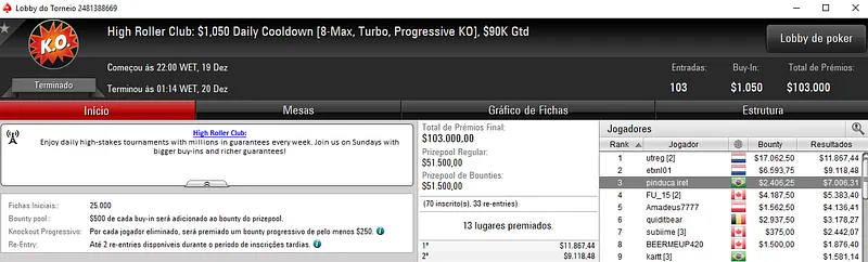 Já no High Roller Club: $530 Daily Supersonic com 166 entradas, 2Much$4U_08 caiu no heads-up e forrou $13,048 de premiação. Este torneio distribuiu $84,580 de prize pool pelos 19 melhores classificados.