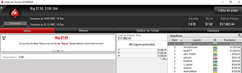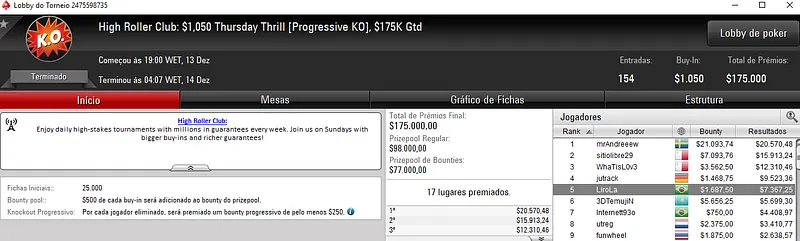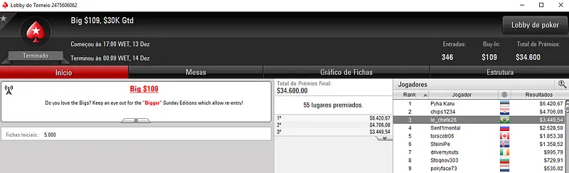 Já batataxpp também forrou pesado ao conquistar o $109 Mini Thursday Thrill com 1,493 entradas. O jogador verde e amarelo levou para o caixa $18,357 de premiação junto com o título. Este torneio repartiu $149,300 de prize pool acumulado.