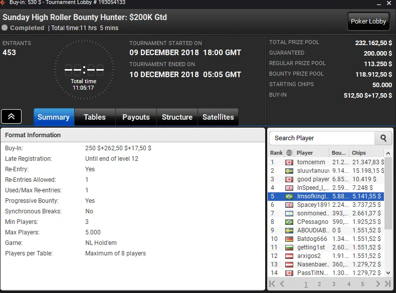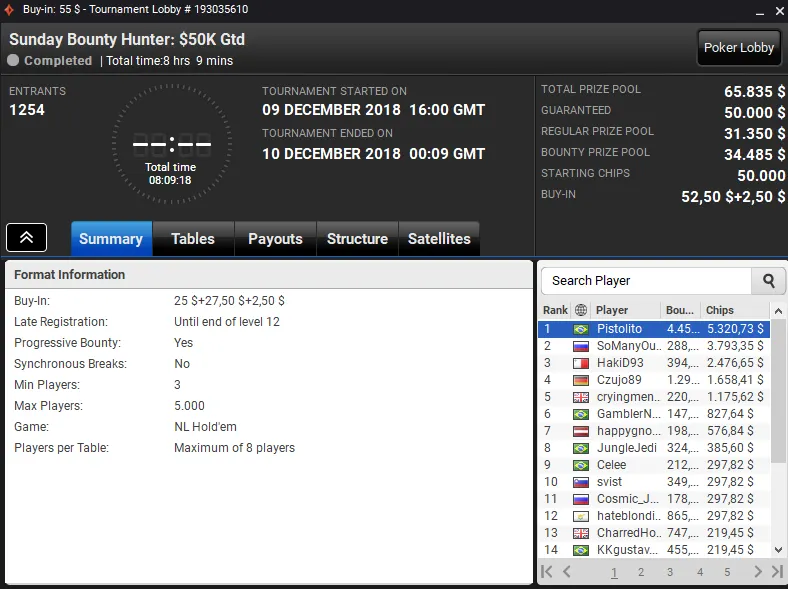 Lincon "lincownz" Freitas deu mais uma vez nas vistas no poker online ao sair com a medalha de prata no Sunday High Roller Bounty Hunter com 177 entradas. O jogador verde e amarelo levou para o caixa $20,409, entre prêmio e bounties. Este torneio distribuiu o prize pool garantido de $200,000.