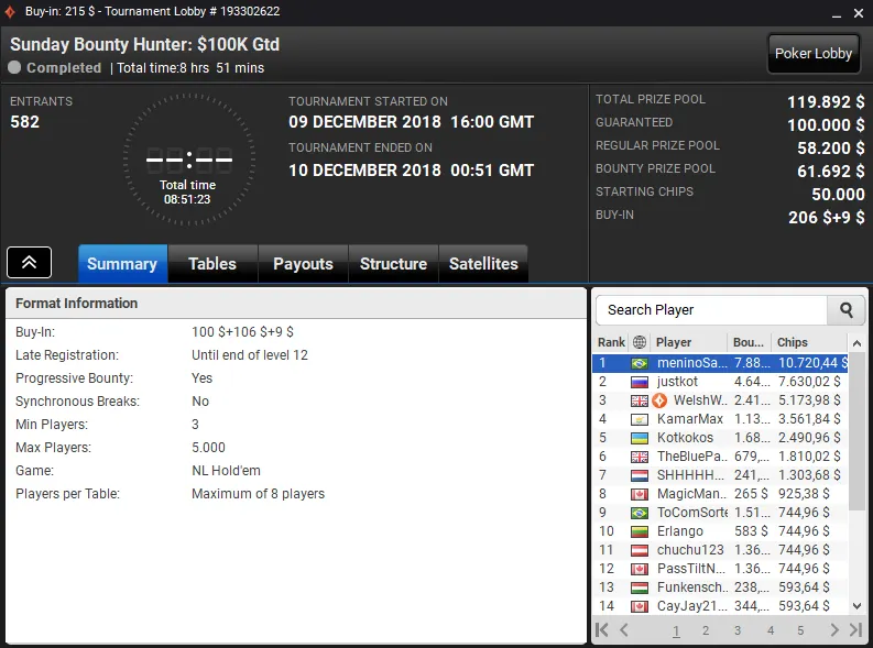 Neville "NevilleWeeee" Costa cravou o Sunday Bounty Hunter [Special Edition] para receber $21,748 de premiação. Este evento acolheu 5,686 entradas que fizeram o prize pool subir aos $179,109.