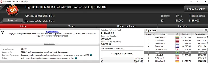 Thiago "KKremate" Crema foi o grande vencedor do dia ao terminar o High Roller Club: $530 Bounty Builder HR na segunda colocação. Este torneio acolheu 248 entradas e o jogador nacional levou para o caixa $16,487, entre prêmio e bounties.