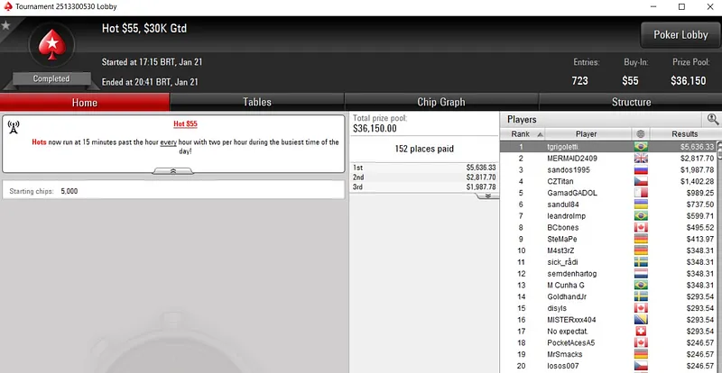 Já Daniel "dani aziz" Aziz forrou um belo prêmio de quatro dígitos no Bounty Builder $55. O brasileiro levou a melhor entre um field de 1.265 entradas e foi recompensado com um prêmio de US$ 9.728.