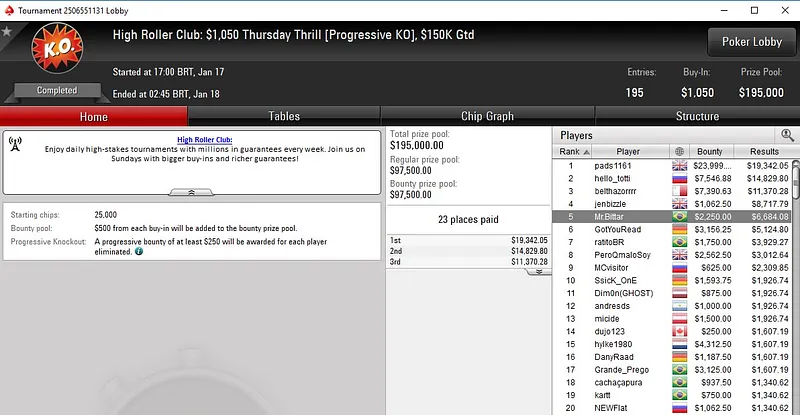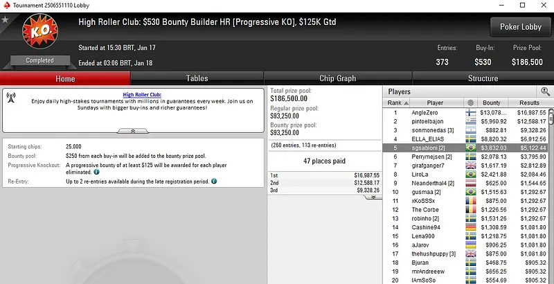 O título do Bounty Builder $44 também veio para o Brasil. "andergoes" foi o melhor entre um field de 2.134 jogadores e recebeu um prêmio total de US$ 10.255 pelo seu desempenho.