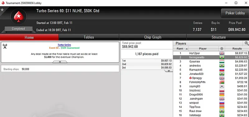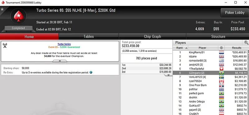 Já "JANU171" ficou muito perto do título no Turbo Series 62: $22+R NLHE. O brasileiro só não bateu um dos oponentes, entre um field que registrou 3.802 entradas, e foi vice-campeão para $20.452.