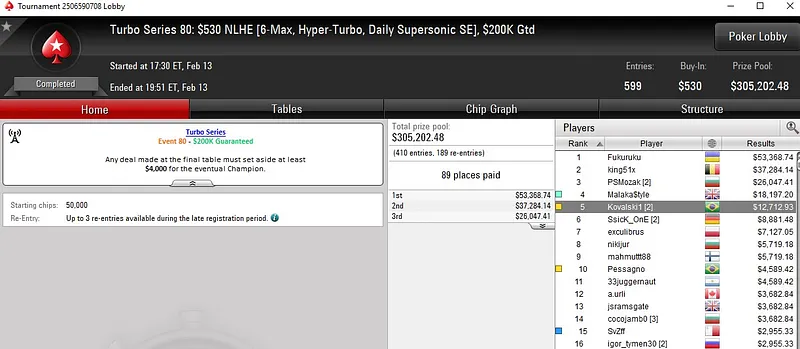No Turbo Series 78: $1.050 NLHE [Progressive KO], torneio que registrou 555 entradas e $555k de premiação, "PIUlimeira" despachou toda a concorrência e faturou um prêmio total de $101.768. Também na mesa final esteve João Mathias joaoMathias" Baumgarten, nono colocado para $7.947.