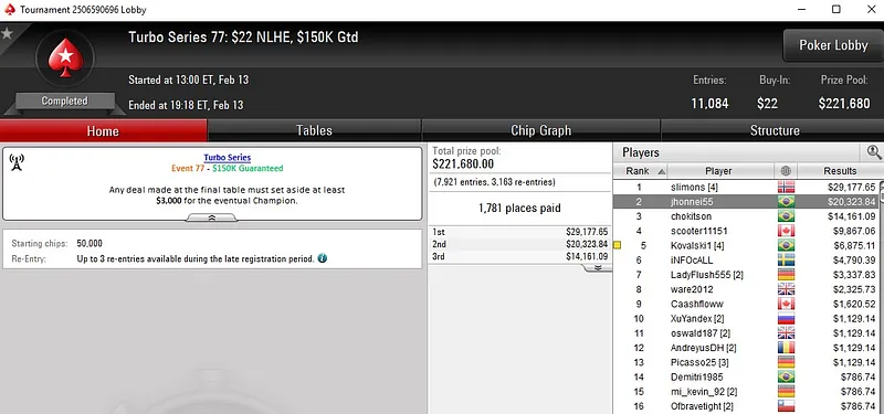 Já no Turbo Series 81: $55 NLHE [8-Max] foi o brasileiro Yago "yhsimplicio" Simplício quem levou a melhor entre um field de 2.149 entradas, vendo seu desempenho recompensado com um prêmio de $16.067.