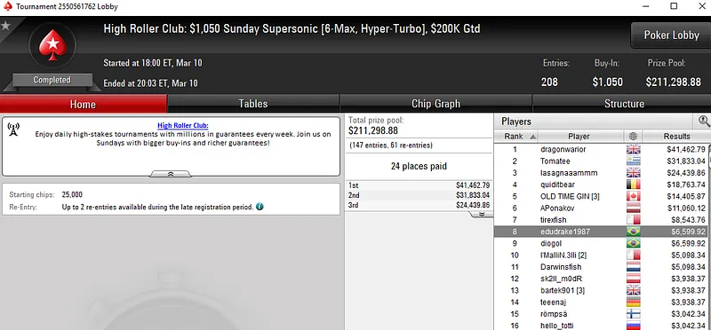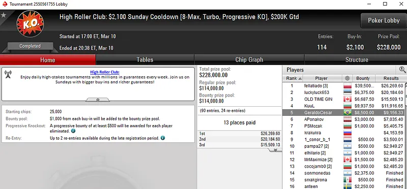 Já no PokerStars, Geraldo reservou lugar na mesa final em um dos torneios mais caros do High Roller Club. O brasileiro foi 5º colocado no $2.100 Sunday Cooldown [8-Max, Turbo, PKO], torneio que registrou 114 entradas, e engordou seu bankroll com mais US$ 17.656.