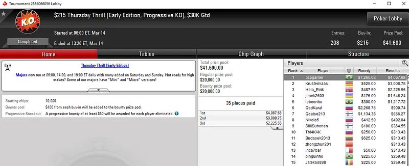 Quem também faturou um prêmio de cinco dígitos foi "bcpgamer" ao vencer o $215 Thursday Thrill [Early Edition, PKO]. O brasileiro despachou os 207 adversários que teve pela frente e subiu ao lugar mais alto do pódio para receber um prêmio de US$ 11.333.