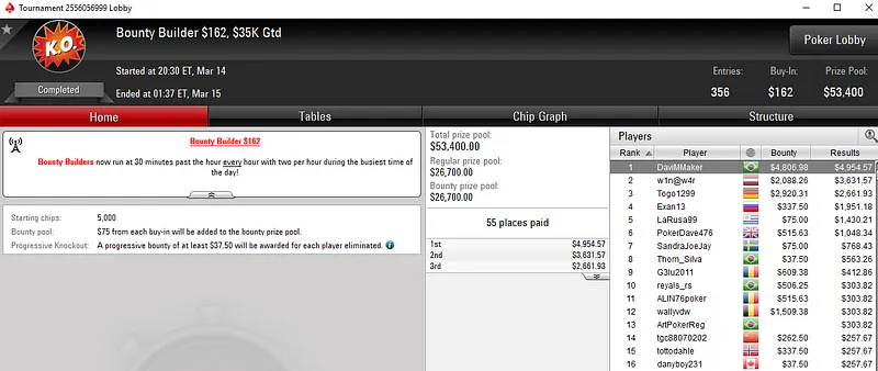 Já "DaviMMaker", cravou o Bounty Builder $162 para embolsar um prêmio de US$ 9.761, e "gtavares10" levou a melhor entre um field de 2.978 entradas no Bounty Builder $33 para engordar o seu bankroll com US$ 8.712.