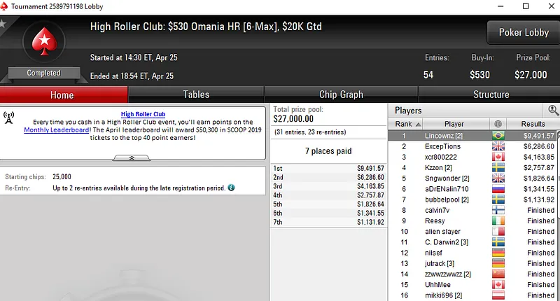 Outro dos jogadores em destaque na reta de ontem foi Lincon "Lincownz" Freitas, com duas mesas finais, incluindo uma vitória, nos torneios do High Roller Club. O brasileiro soltou o grito de campeão no US$ 530 Omanha HR para US$ 9.491 e embolsou mais US$ 7.045 ao terminar na quarta colocação do US$ 530 Daily 500.