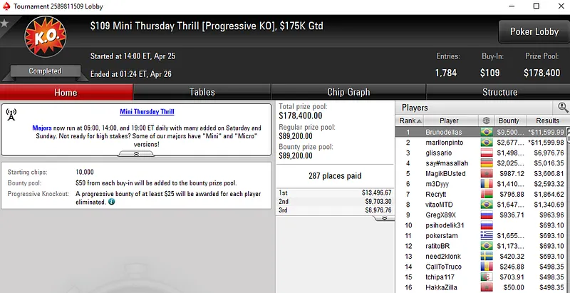 No US$ 109 Mini Thursday Thrill PKO, o Brasil fez dobradinha e levou uma boa parte dos US$ 178 mil em disputa. Após acordo no heads-up, "Brunodellas" foi o campeão e embolsou US$ 21.100, enquanto o seu compatriota Marllon "marllonpinto" Pinto engordou o bankroll com US$ 14.277.