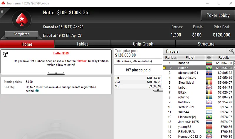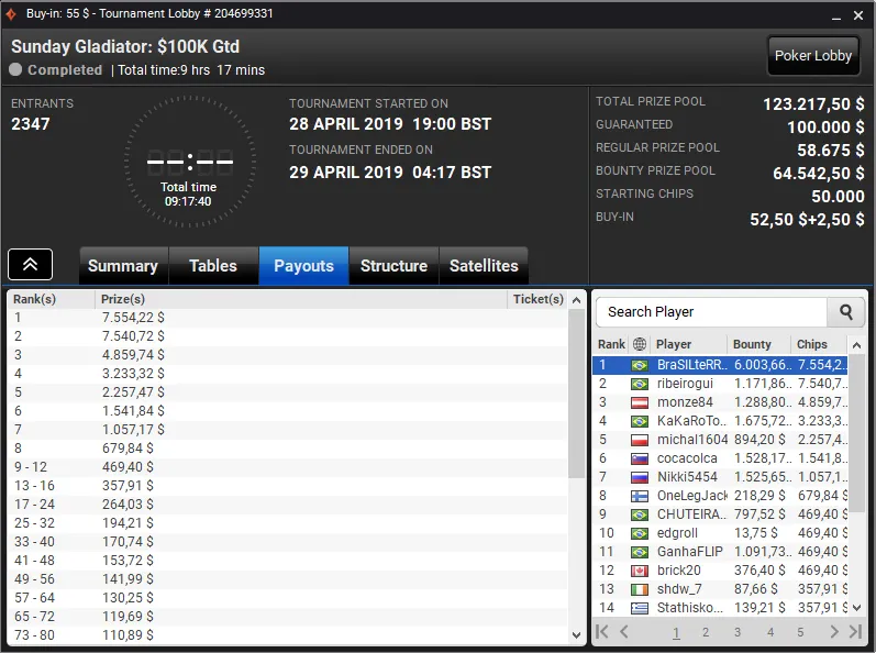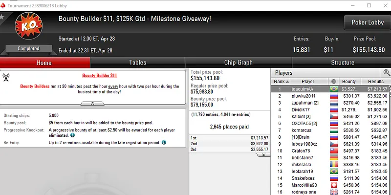 Já o grinder "glnas" soltou o grito de campeão no Bounty Builder US$ 33 do PokerStars e garantiu um belo prêmio de cinco dígitos. O brasileiro bateu um field de 7.167 entradas e viu seu desempenho recompensado com US$ 20.908.