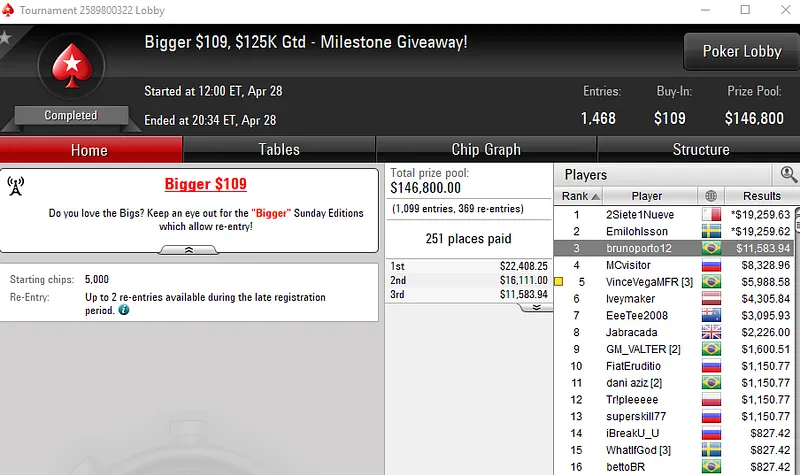 A edição de ontem deste torneio viu 3.778 entradas na briga por uma parte dos quase U$ 378 mil em disputa e foi o brasileiro quem garantiu a maior fatia do bolo, um prêmio de US$ $44.963.