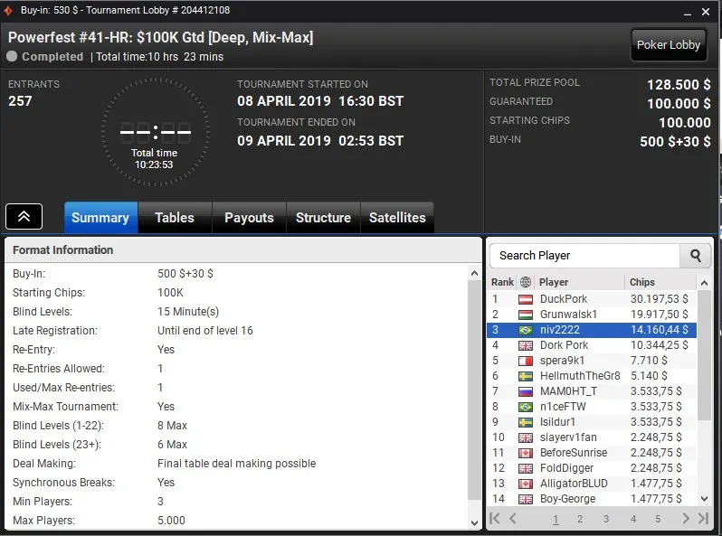 Quem também engordou o bankroll com uma premiação de cinco dígitos foi "niv2222". O brasileiro terminou no terceiro lugar do pódio no Powerfest #41-HR: $100K Gtd [Deep, Mix-Max] e garantiu US$ 14.160.