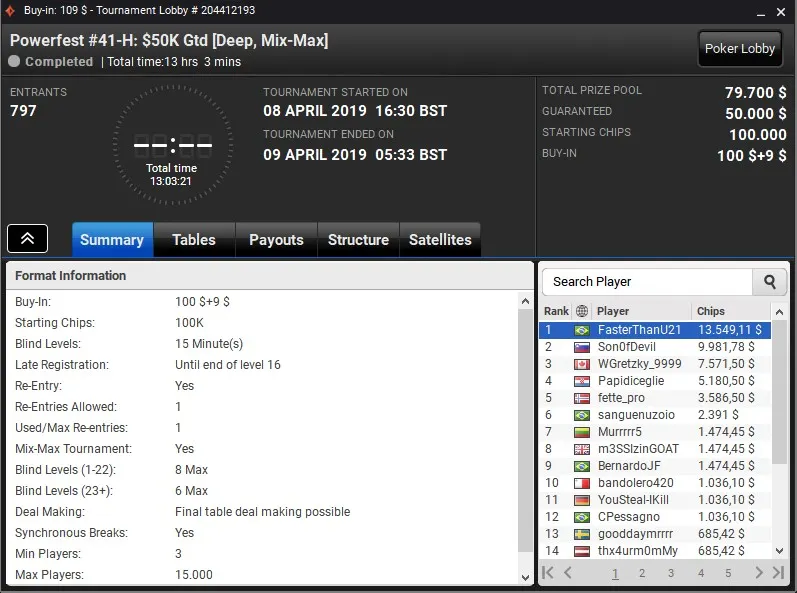 Já no Powerfest #41-H: $50K Gtd [Deep, Mix-Max], "FasterThanU21" superou 796 oponentes para se sagrar campeão e levou para casa US$ 13.549.