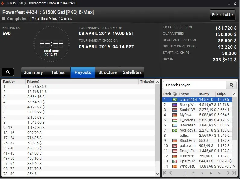 Outro dos títulos do Brasil na série foi conquistado por "crazy6464", jogador que levou a melhor entre um field de 590 entradas no Powerfest #42-H: $150K Gtd [PKO, 8-Max] para receber US$ 27.355.