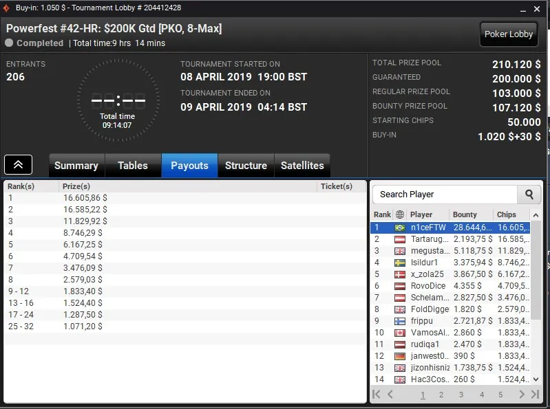 "n1ceFTW" despachou 205 oponentes no Powerfest #42-HR: $200K Gtd [PKO, 8-Max] e terminou no topo do pódio para embolsar um prêmio total de US$ 45.250.