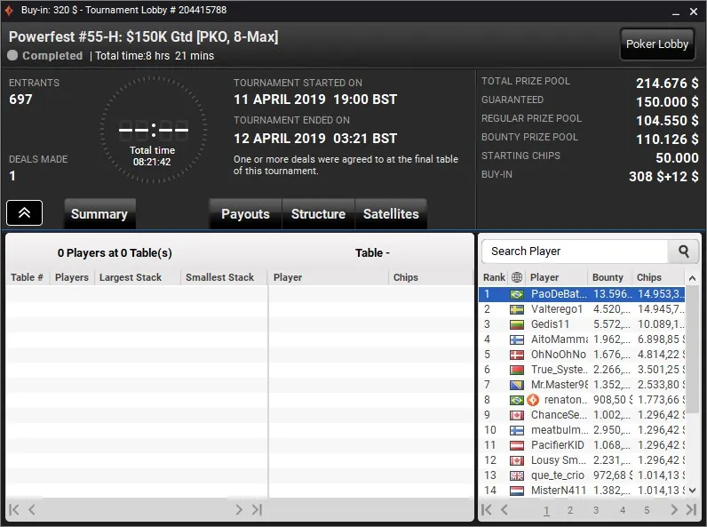 O segundo título do dia veio no Powerfest #58-H: $50K Gtd [PKO, Fast, 8-Max], torneio onde o brasileiro "Neecoooo" despachou 639 adversários para subir ao topo do pódio e engordar seu bankroll com US$ 11.749.
