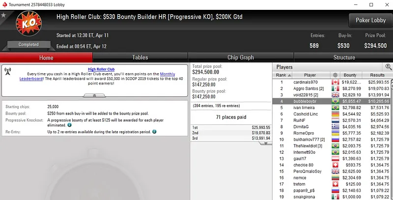 Já nas mesas do PokerStars, o Brasil teve dois representantes na mesa final do High Roller Club: $530 Bounty Builder HR PKO. Bruno "bubbleboybr" Severino foi quarto colocado para US$ 16.121 e Ivan "Ivan limeira" Limeira levou para casa US$ 10.330 pela quinta colocação.