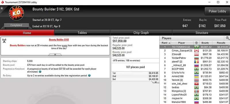 Já “TIO TONINHO”, soltou o grito de campeão no Bounty Builder $162. O brasileiro superou 646 adversários e subiu ao lugar mais alto do pódio para receber um prêmio de US$ 17.401.