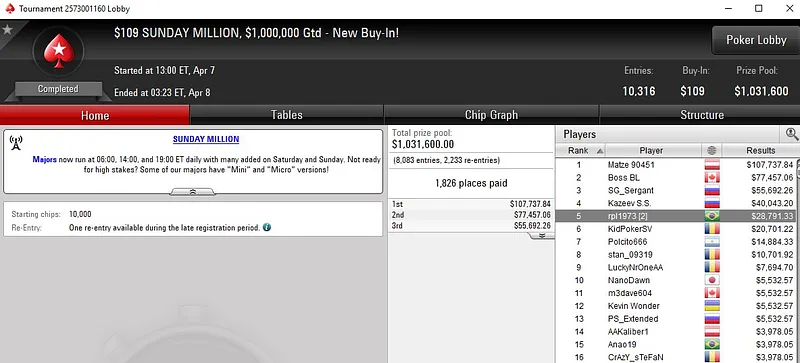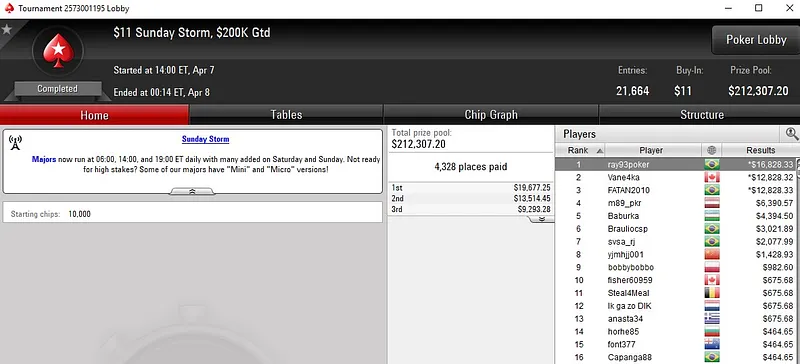 O dono da conta "ray93poker" foi o grande campeão do $11 Sunday Storm e embolsou uma premiação de US$ 16.828 após despachar 21.663 adversários. A medalha de bronze ficou para o seu compatriota "FATAN2010", que levou US$ 12.828 pela terceira colocação.