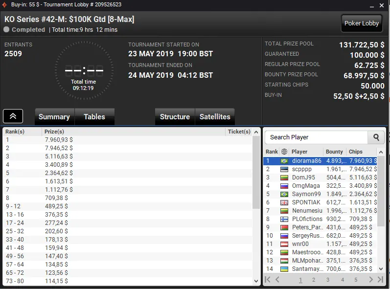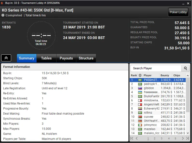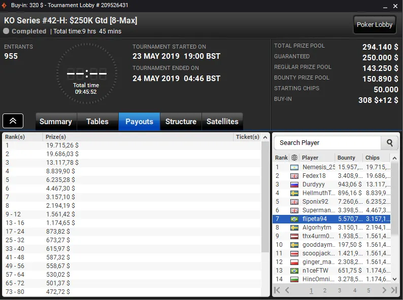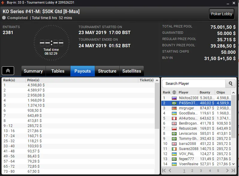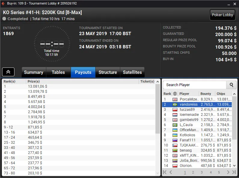 O jogador do Pocarr Team superou toda a concorrência no KO Series #43-HR: $200K Gtd [8-Max, Fast], evento com buy-in de US$ 1.050 que registrou 213 entradas, e subiu ao topo do pódio para receber um prêmio de US$ 43.137.