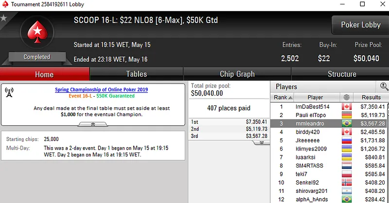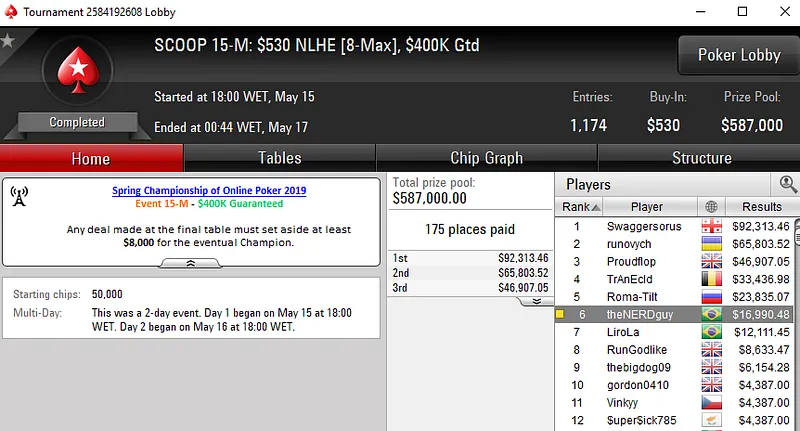Já o dono da conta "ghcastilho18", foi o grande campeão do SCOOP 15-L: US$ 55 NLHE [8-Max]. O brasileiro superou 7.182 oponentes e viu seu desempenho recompensado com um prêmio de US$ 48.684.