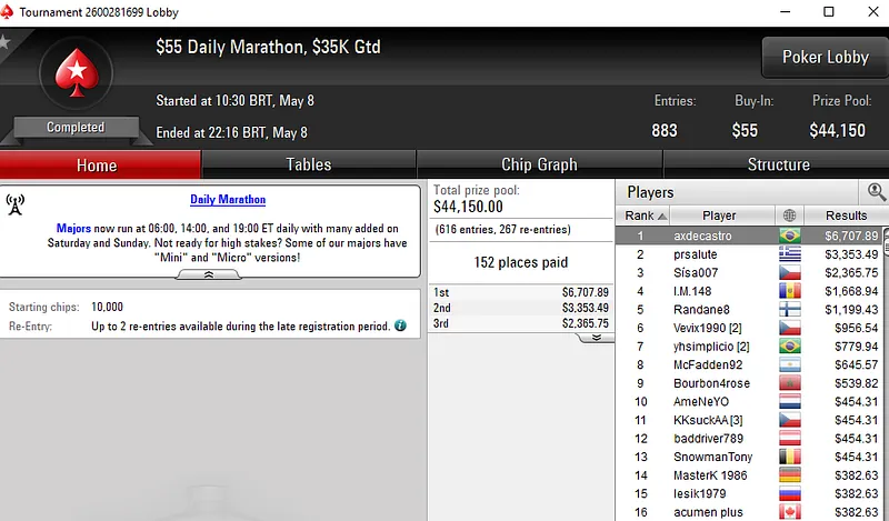 No US$ 1.050 Wednesday High Roller 8-Max, torneio que registrou 106 entradas e um prize pool de US$ 106 mil, "dennysamos2" subiu ao terceiro do pódio e levou para casa um prêmio de US$ 14.420.