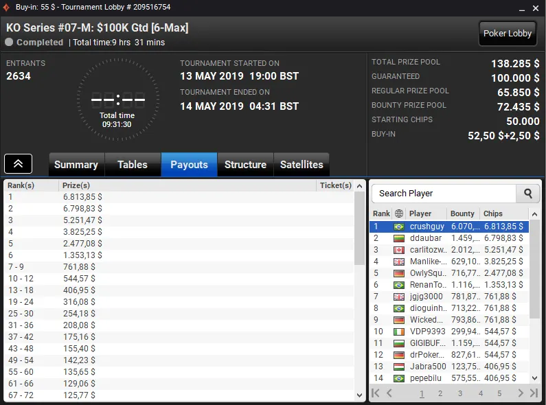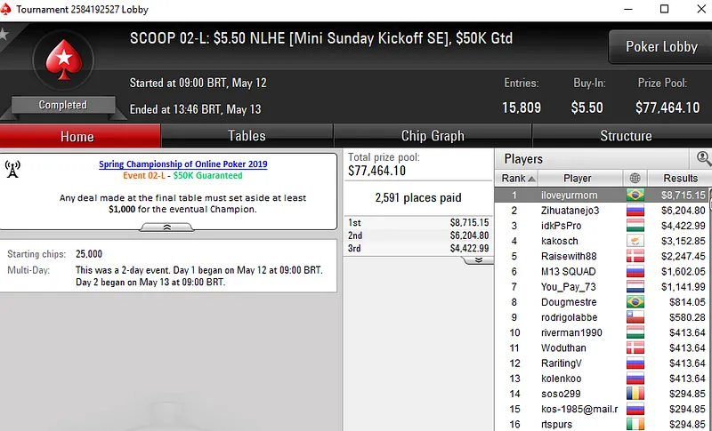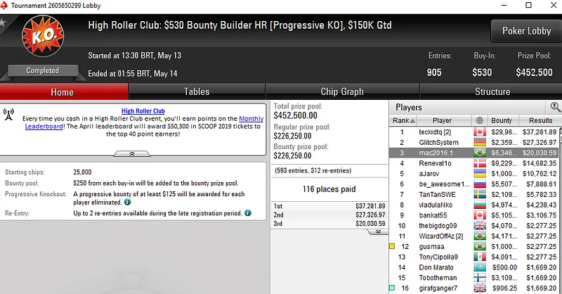 Quem também faturou um belo prêmio de cinco dígitos foi "BIELXXT96". O brasileiro subiu ao segundo lugar do pódio no SCOOP 02-M: $55 NLH [Sunday Kickoff SE] e levou para casa um prêmio de US$ 30.242. Na quinta colocação ficou "igorcn" com direito a US$ 10.024.