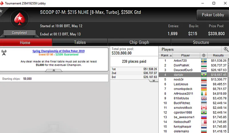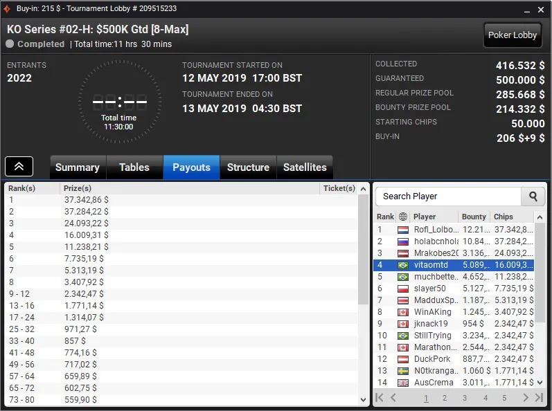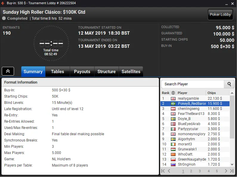 Outro brasileiro que também se deu bem nos torneios do High Roller Club foi "kartt". O jogador levou a medalha de bronze no US$ 2.100 Sunday Cooldown para US$ 24.687 e faturou mais US$ 9.283 pela quinta colocação no US$ 530 Sunday 500.