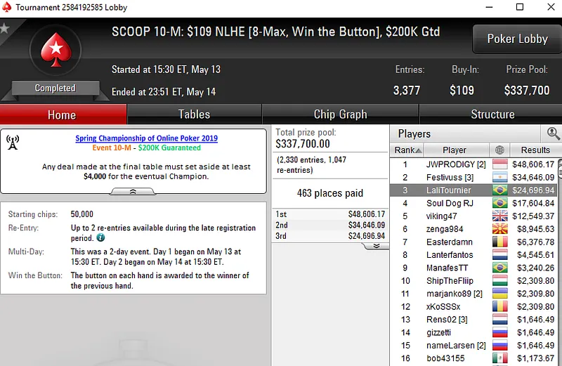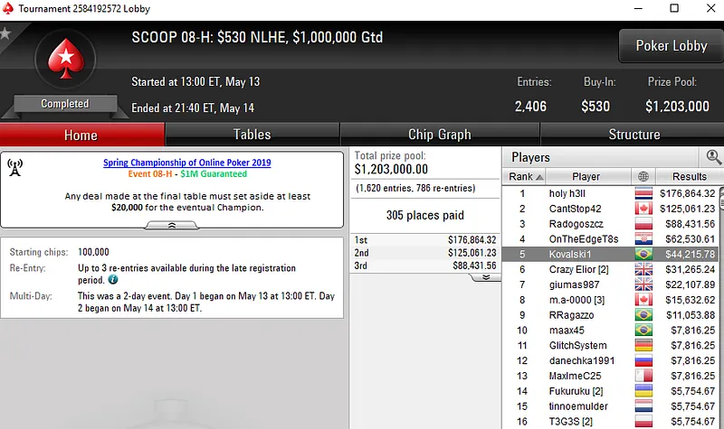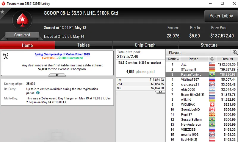 Fabiano "Kovalski1" Kovalski, Lauriê "LaliTournier" Tournier e Renan Toniolo também faturaram em mesas finais do Spring Championship of Online Poker. Confira os resultados abaixo: