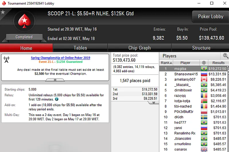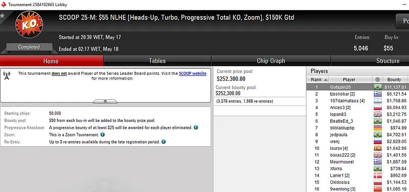 No SCOOP 21-L: US$ 5.50 NLHE, foi "msgiba" quem soltou o grito de campeão, após superar um field de 9.382 entradas, e embolsou US$ 19.272. No SCOOP 25-M: US$ 55 NLHE [HU, Turbo, Total PKO, Zoom], Luigi "Gofaziin26" Soncin venceu todos os confrontos heads-up e faturou US$ 11.137.