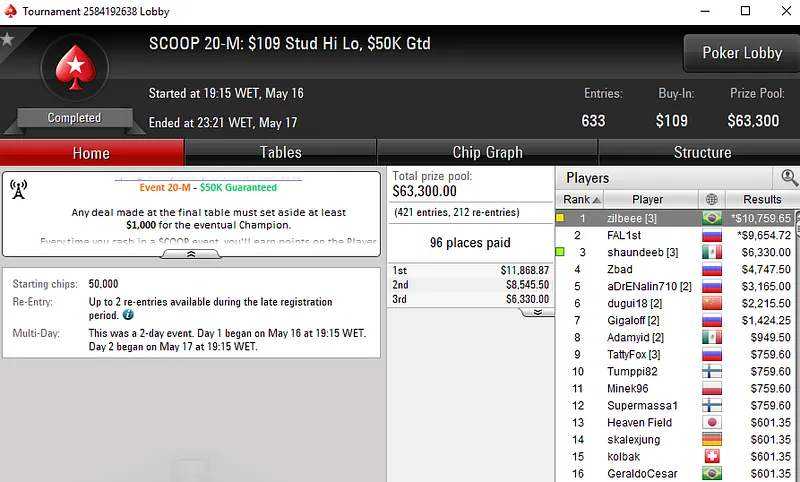 Já no SCOOP 20-M: US$ 109 Stud Hi Lo, Matheus "zilbeee" Zilberknop garantiu o terceiro título do dia para o Brasil. O grinder brasileiro despachar 632 oponentes e subiu ao topo do pódio para receber US$ 10.759.