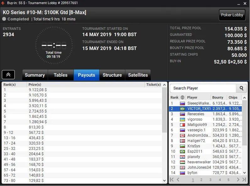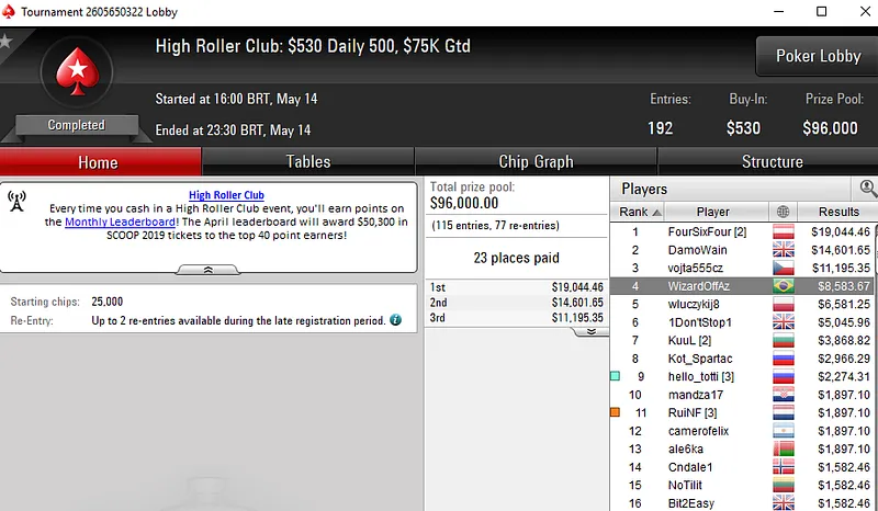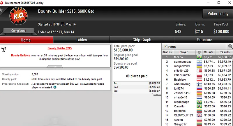 O grinder brasileiro reservou um lugar no pódio do High Roller Club: US$ 530 Bounty Builder HR PKO, torneio que registrou 1.016 entradas e mais de US$ 500 mil em prêmios, e embolsou US$ 31.245 ao terminar na terceira colocação.