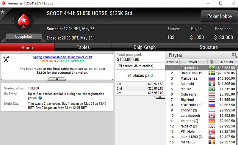No SCOOP 44-H: US$ 1.050 HORSE, foi Felipe "felipebeltra" Beltrane quem soltou o grito de campeão, após superar um field de 133 entradas, e embolsou US$ 25.663. Felipe entrou assim para o grupo de bicampeões do SCOOP 2019, pois ontem já tinha cravado o SCOOP 39-M.