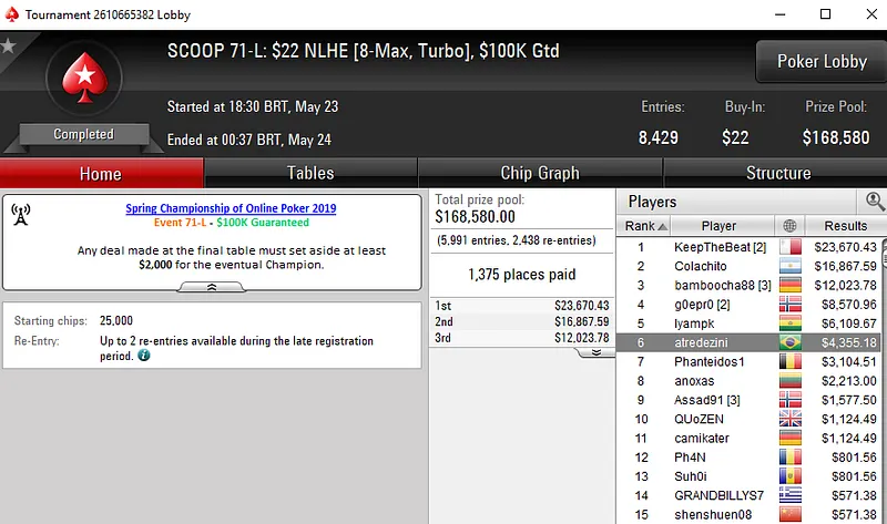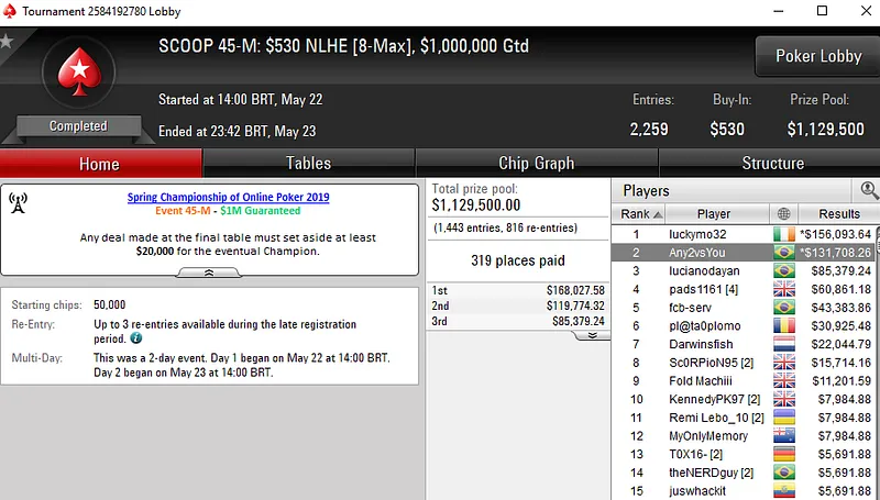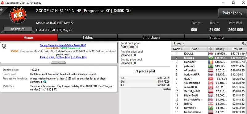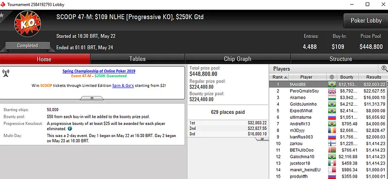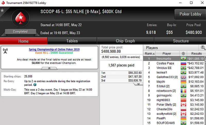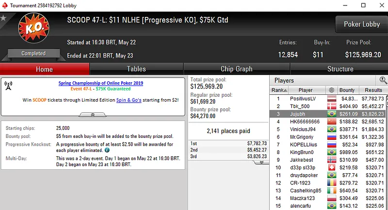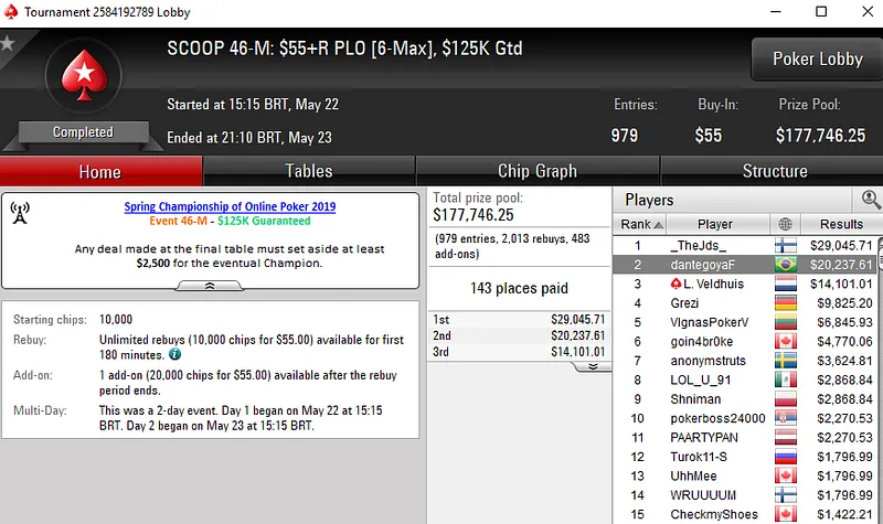 No SCOOP 55-L: US$ 55 NLHE [8-Max], Francisco "fmrsmurilo" Souza levou a melhor em um field de 9.618 entradas e faturou US$ 61.086. Já no SCOOP 47-M: US$ 109 PKO, "fAArid88" garantiu o terceiro título do dia para o Brasil. O grinder brasileiro despachar 4.488 oponentes e subiu ao topo do pódio para receber US$ 44.157.