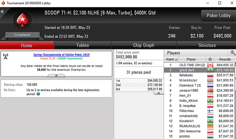 Já Bruno "great dant" Volkmann, subiu ao segundo lugar do pódio no SCOOP 71-H: US$ 2.100 NLHE [8-Max, Turbo] para receber a medalha de prata e um prêmio de US$ 72.145.