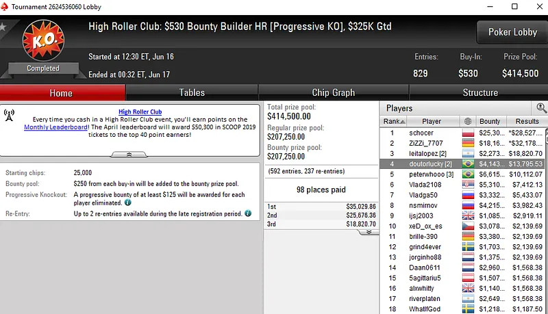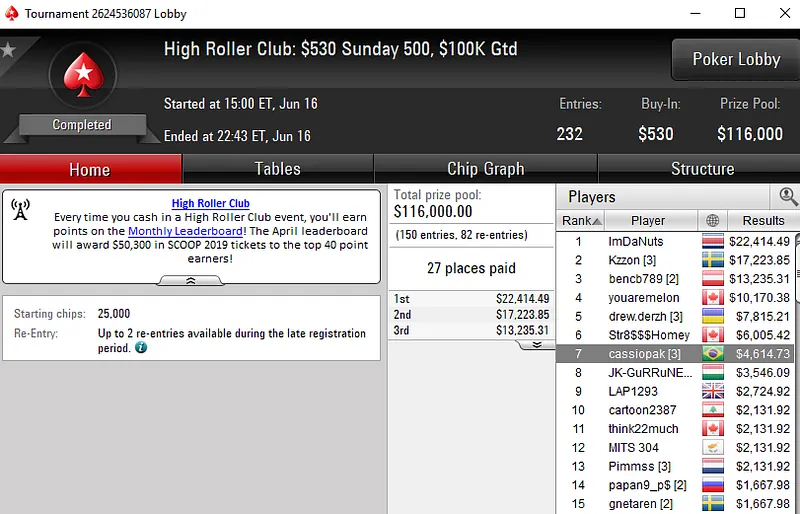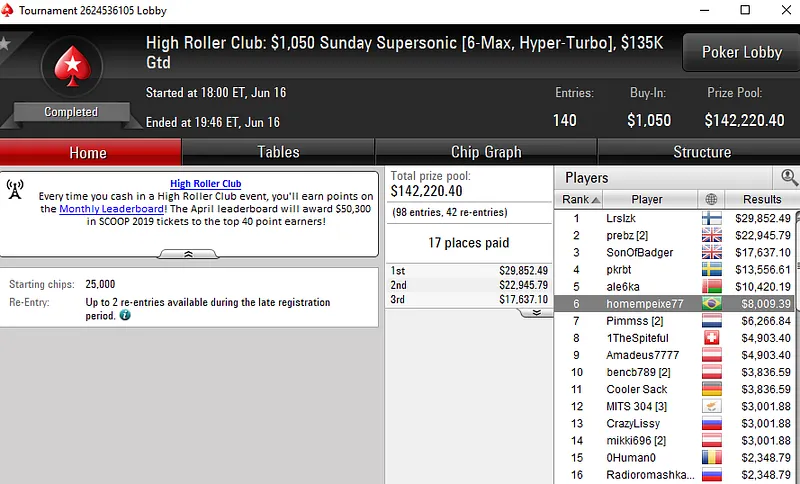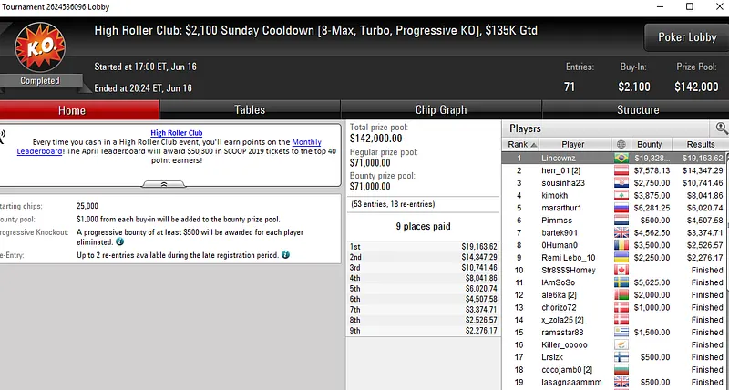 Os brasileiros também forraram pesado nos torneios do High Roller Club. No US$ 2.100 Sunday Cooldown, Lincon "Lincownz" Freitas despachou 70 oponentes para faturar o título e um prêmio de US$ 38.491.
