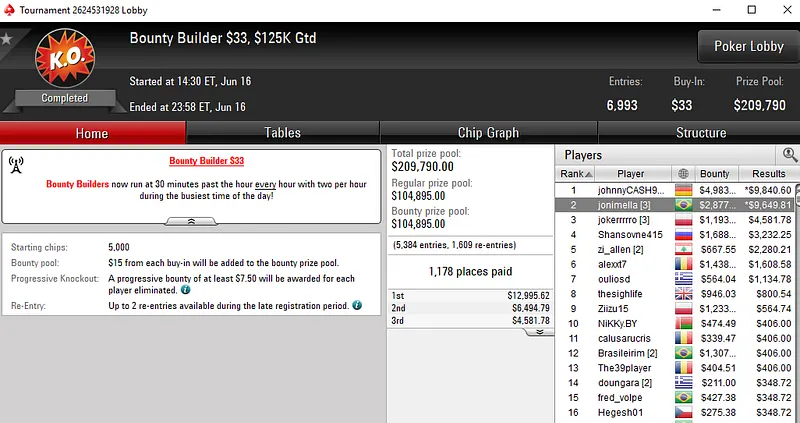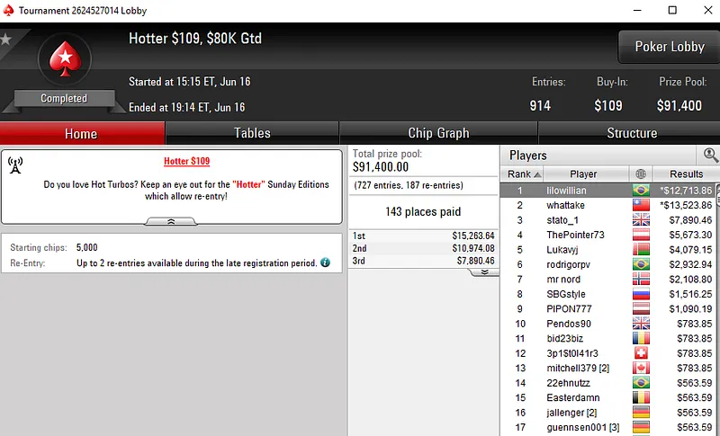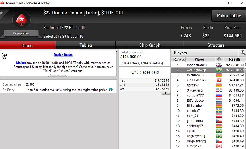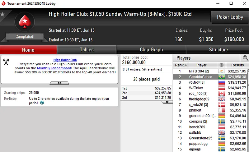 Já Geraldo "GeraldoCesar" César, por muito pouco não cravou o US$ 1.050 Sunday Warm-Up [8-Max]. O brasuca só não superou um dos 159 adversários que teve pela frente e embolsou US$ 24.958 pela segunda colocação.