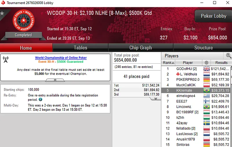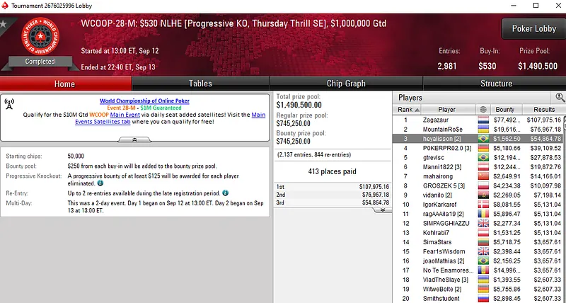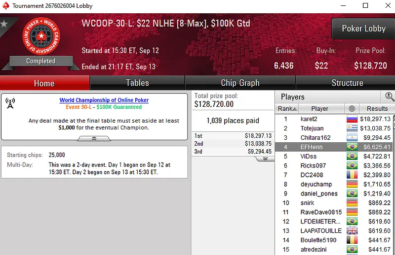 Na mesa final, Bruno teve a companhia de outros três brasileiros — "7jujuba7" (4º para US$ 18.378), "Rosenberg77" (7º para US$ 6.318) e "OtavioSnuts" (8º para US$ 5.355).