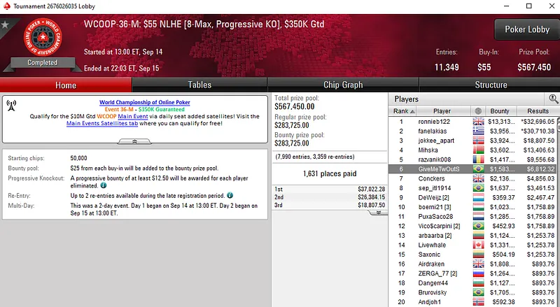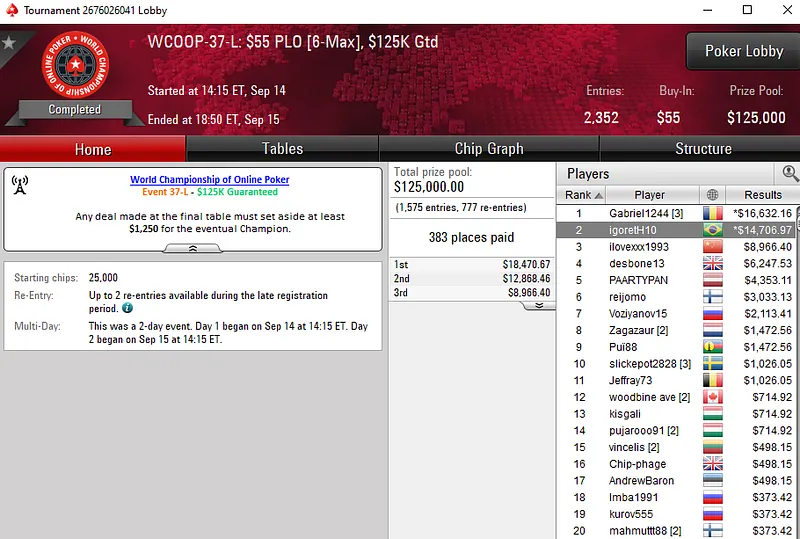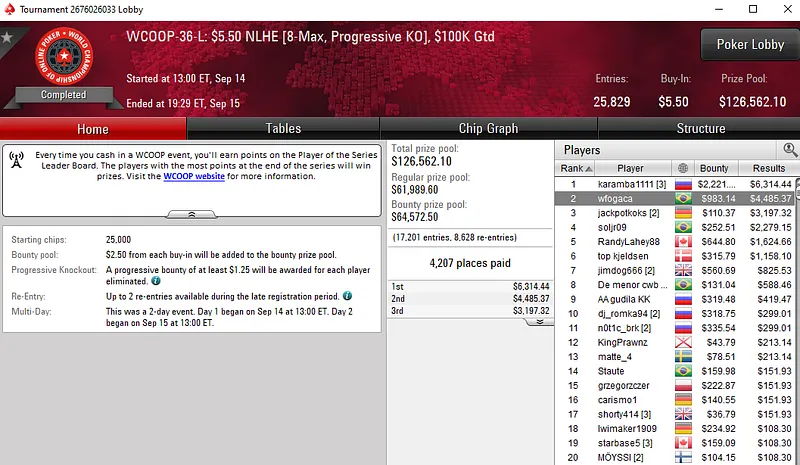 Outros resultados na reta de domingo do WCOOP: