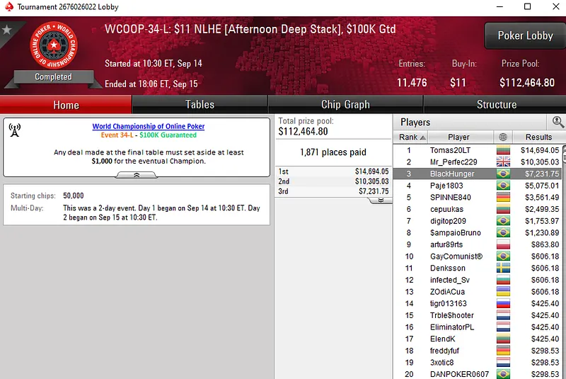 Já João Hayashi, subiu ao pódio do WCOOP-34-M: US$ 109 NLHE [Afternoon DeepStack], evento que registrou 2.787 entradas. Pilotando a conta "HayashiJoão" no PokerStars, o brasileiro garantiu a medalha de bronze e um prêmio de US$ 20.697.