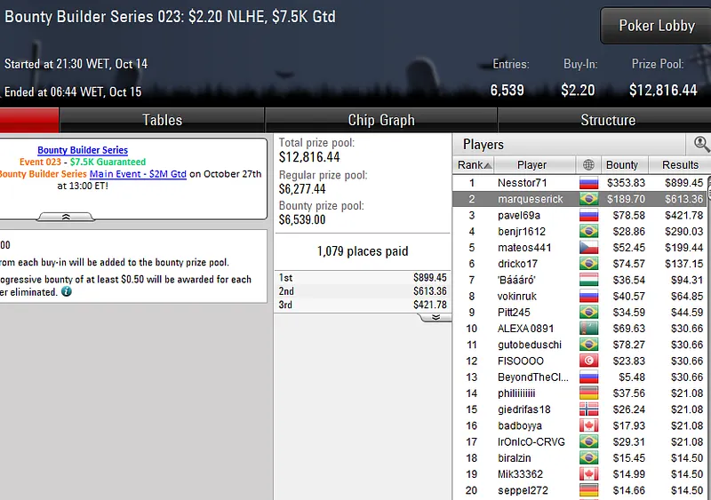 Na mesa final, o brasuca teve a companhia do compatriota "Dieferson09", jogador eliminado na oitava posição com direito a um prêmio de US$ 3.732.