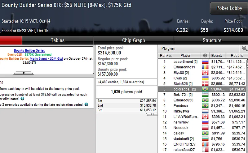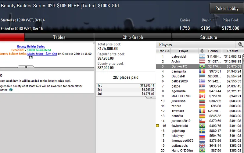 Quem também forrou nos eventos da série foi Caio "Pessagno" Pessagno. O grinder brasileiro garantiu a medalha de bronze no Bounty Builder Series 016: U$ 215 NLHE [Turbo], torneio que contou com 674 participantes, e faturou um prêmio de US$ 9.797.
