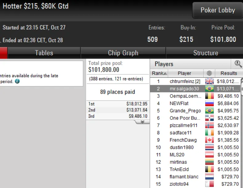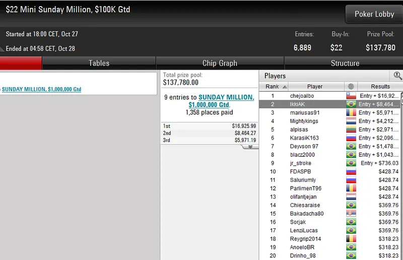 Outro brasileiro que também deu show no PokerStars foi o dono da conta "leelo90". O grinder despachou toda a concorrência no US$ 11 Sunday Storm, que esta semana contou com 16.350 entradas, para engordar o bankroll com um prêmio de US$ 14.791 após acordo no heads-up.