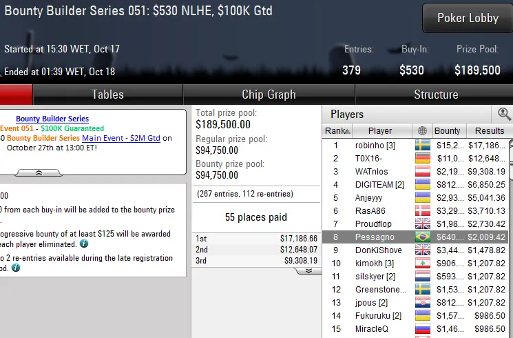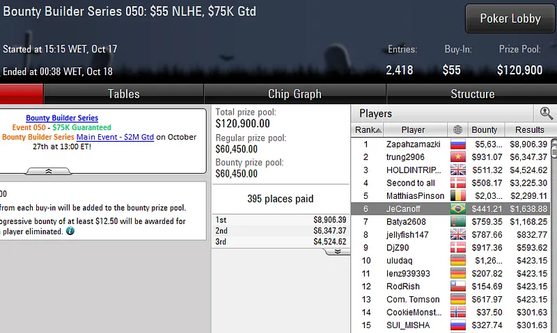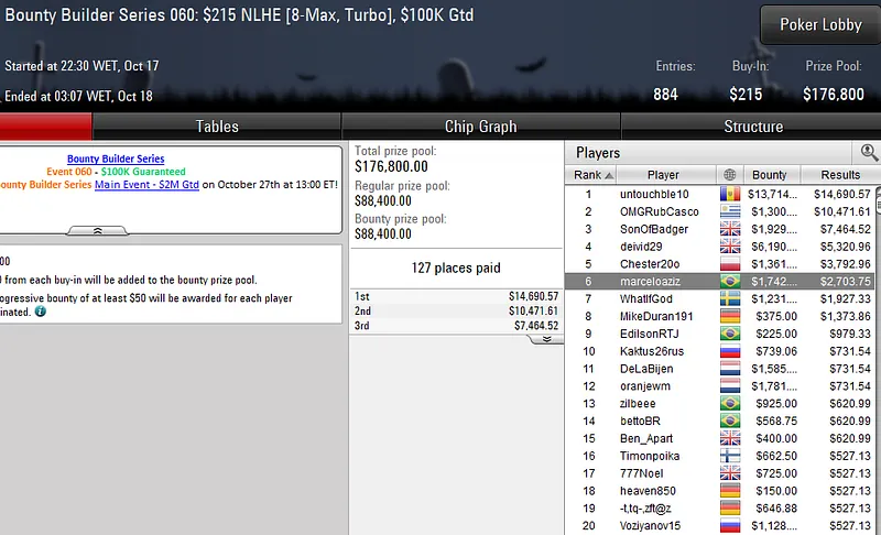 Quem também soltou o grito de campeão na série foi Leonardo "leozerag" Evangelista. O brasuca levou a melhor em um field de 3.233 entradas no Bounty Builder Series 056: US$ 55 NLHE [Turbo] e subiu ao topo do pódio para embolsar US$ 17.994.