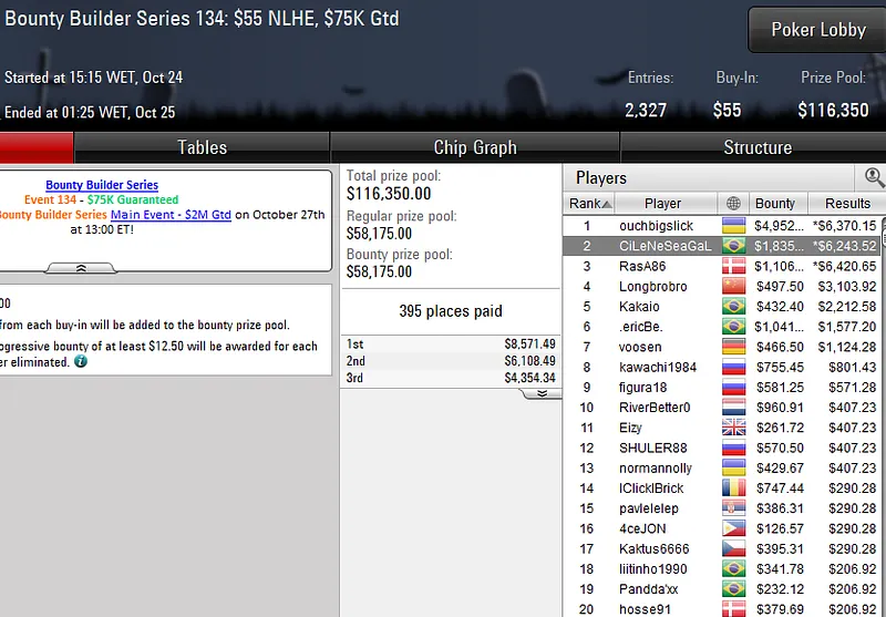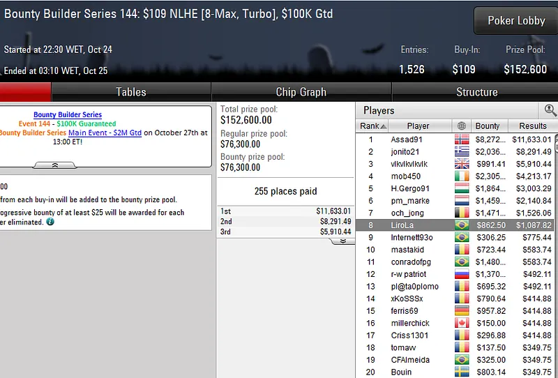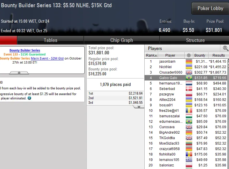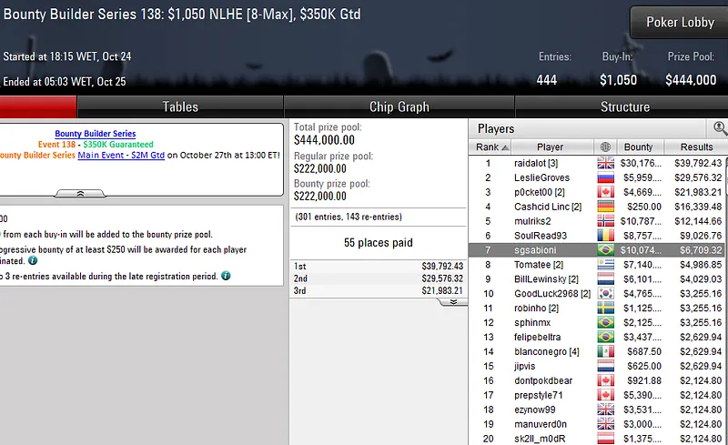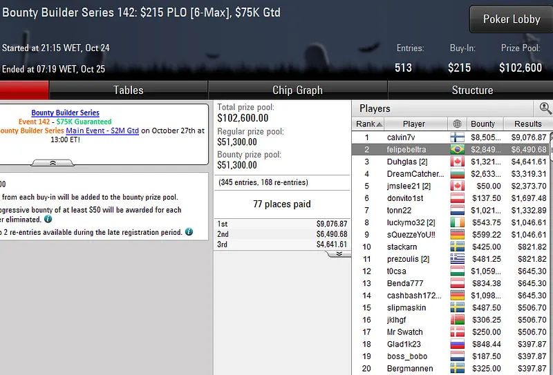 Quem também forrou nos eventos da série foi o brasuca dono da conta "VASKARAN". O grinder reservou um lugar na mesa final do Bounty Builder Series 141: US$ 2.100 PLO [6-Max], torneio que contou com 102 entradas, e faturou um prêmio de US$ 18.163 pela quinta colocação.